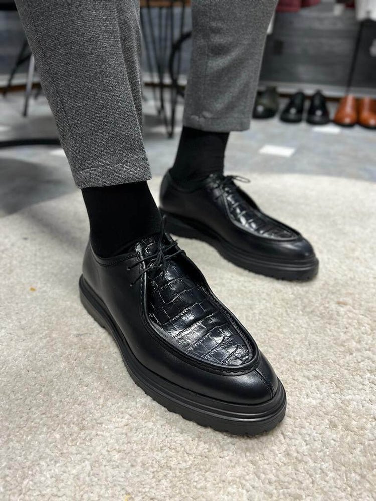 Men’s Derby Shoes – Black Italian Croc Print Buff Leather