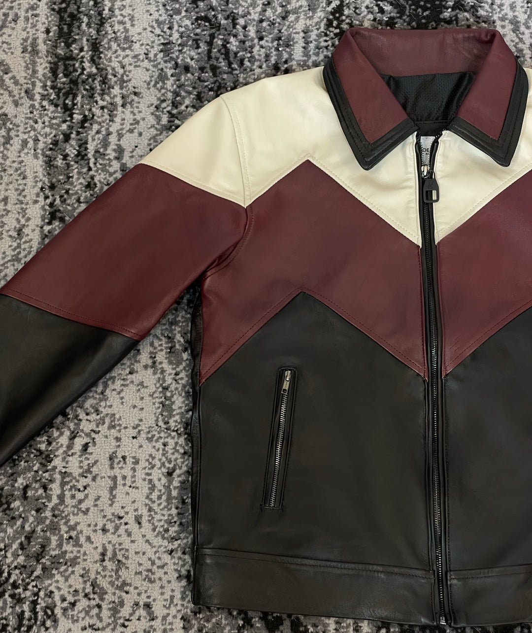 Make a bold style statement with this men’s handcrafted layered moto leather jacket, crafted from premium soft sheep leather in a striking burgundy, cream, and black color combination. Featuring gunmetal YKK hardware, a customized black satin lining, smooth zipper closures, and symmetrical pattern detailing, this custom-made jacket offers a perfect fit, superior comfort, and standout modern biker appeal.