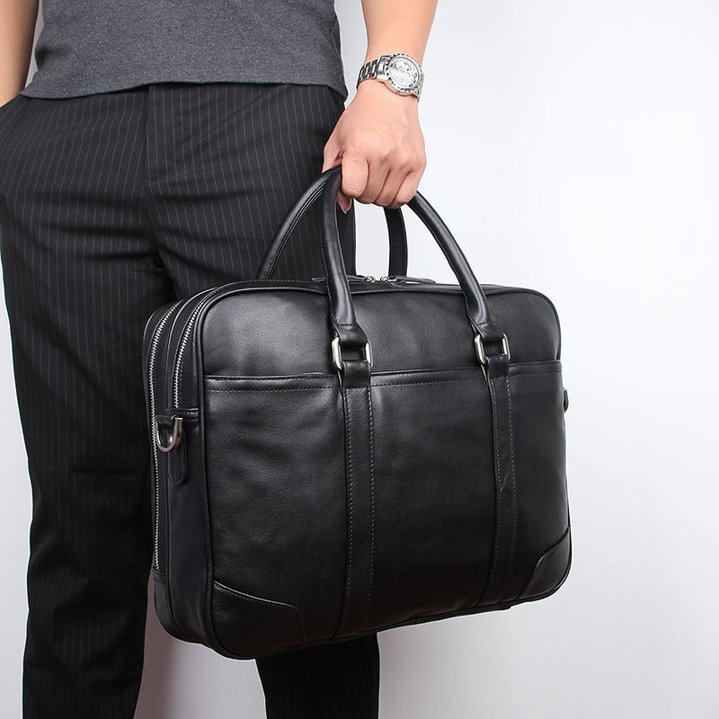 Introducing our Black Leather Laptop Briefcase Bag, crafted from supple buff leather with exquisite attention to detail. This office bag offers both functionality and style to elevate your professional look.