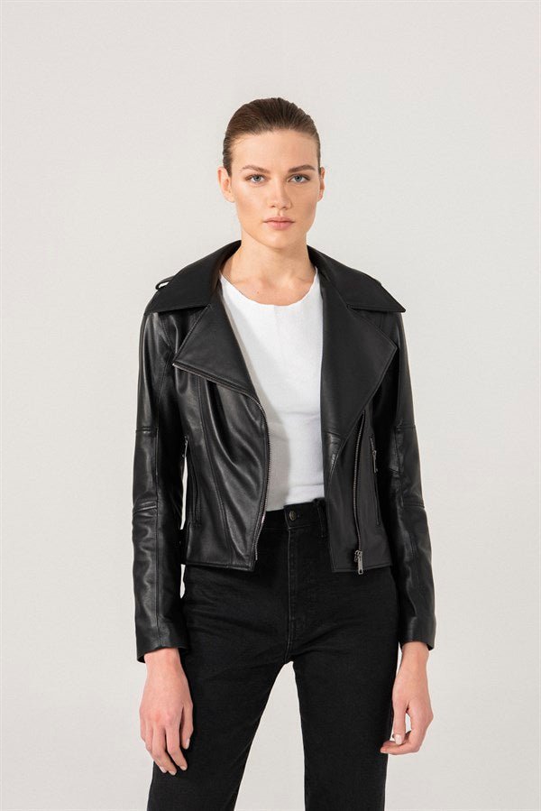 Make a bold statement with this women’s black biker motorcycle leather jacket handcrafted from premium soft lamb leather. Featuring a sleek YKK silver zipper, black satin lining, waist belt detailing, and a relaxed yet flattering fit, this custom-made biker jacket delivers timeless edge, comfort, and personalized craftsmanship for everyday and ride-ready style.